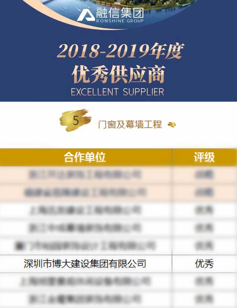 博大建設(shè)集團(tuán)在2018-2019年度成績(jī)突出,榮獲融信集團(tuán)頒發(fā)的門窗及幕墻工程“優(yōu)秀供應(yīng)商”稱號(hào)。融信集團(tuán)創(chuàng)立于2003年,總部位于上海,是中國房企20強(qiáng)。