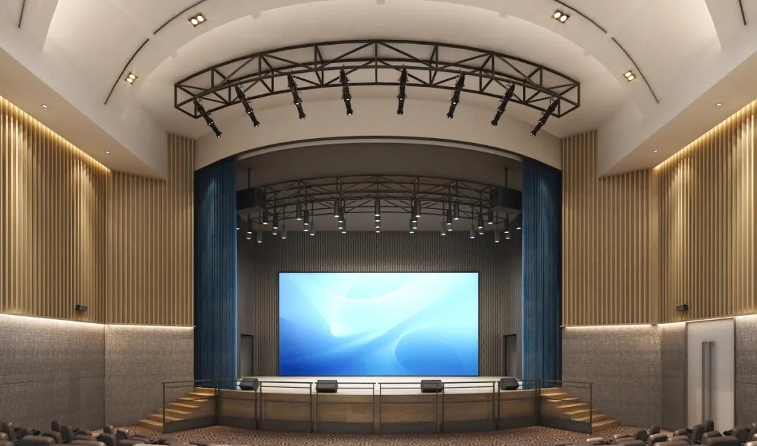 禮堂的設計沒有花俏的成分,主要是對聲音、光的控制,把墻面區分為上下2段,減少人在過高的環境下照成的不適感。