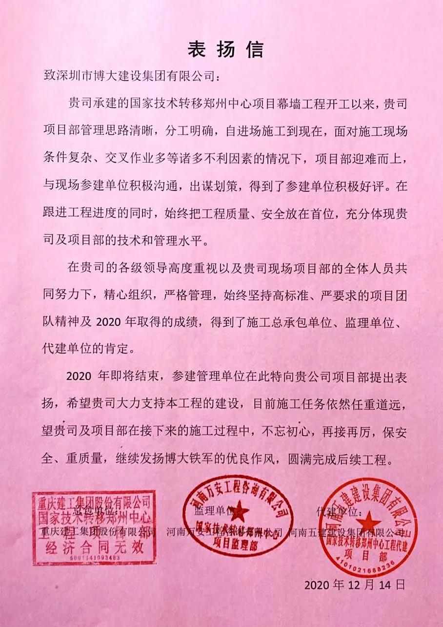 將履約視為生命!這是博大人的莊嚴承諾和工作準則。12月14日,博大建設集團國家技術鄭州轉移中心項目部憑借優質的履約能力贏得總包單位重慶建工集團、代建單位河南五建建設集團、監理單位河南萬安工程咨詢公司等三方的高度認可,并致集團總部以表揚信!