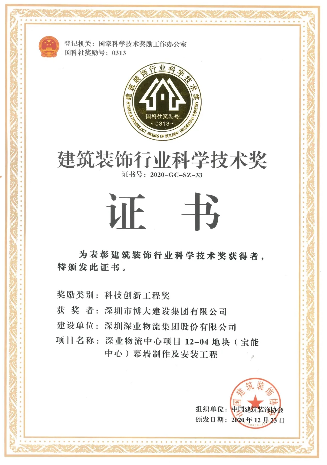 博大建設(shè)集團承建的“深業(yè)物流12-04地塊(寶能中心幕墻制作及安裝工程)”榮獲二0二0年全國建筑行業(yè)科技創(chuàng)新工程獎。